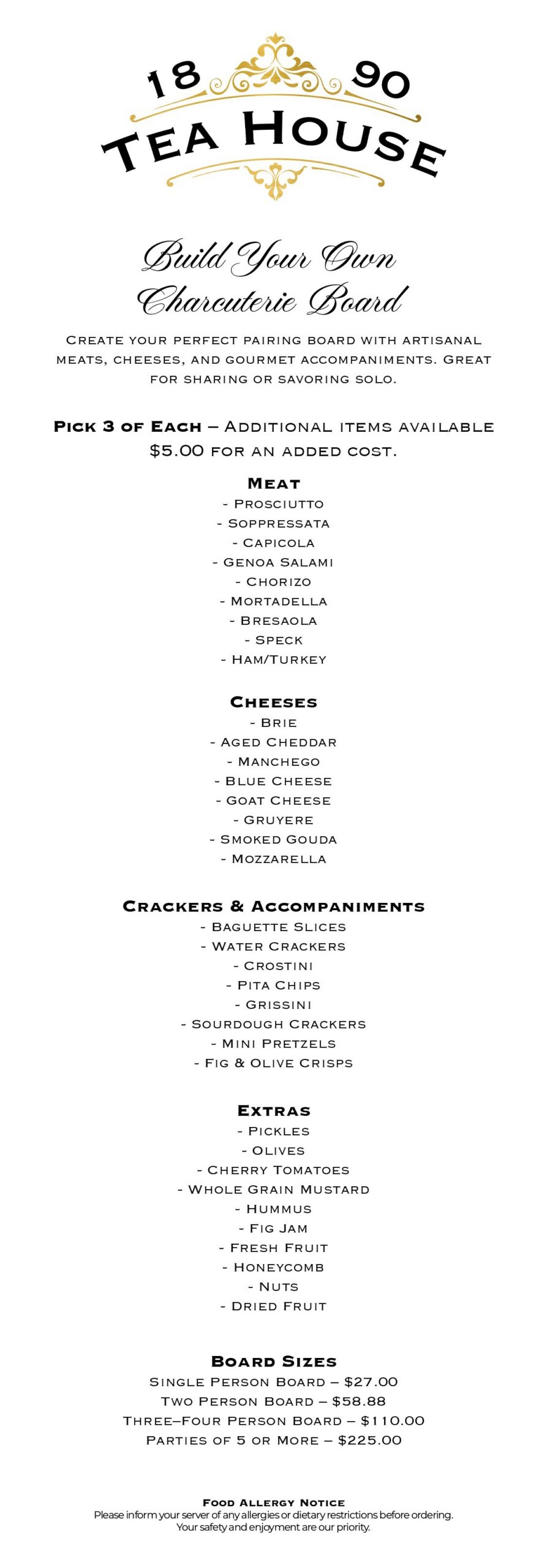 From classic tea sandwiches and charcuterie boards to freshly baked pastries and curated teas, there’s always something delightful waiting for you.